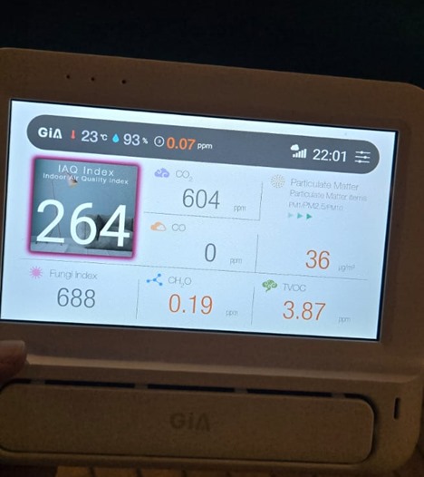 Formaldehida 0.19 ppm, dua kali lipat dari batas aman WHO.Formaldehid (HCHO) adalah senyawa organik volatil (VOC) yang sering ditemukan di dalam ruangan dari bahan bangunan, furnitur, cat, dan asap rokok, atau bahkan dari pengharum ruangan yang kita anggap “wangi”. Gas ini diam-diam melukai tenggorokan, memicu alergi, bahkan berpotensi kanker.