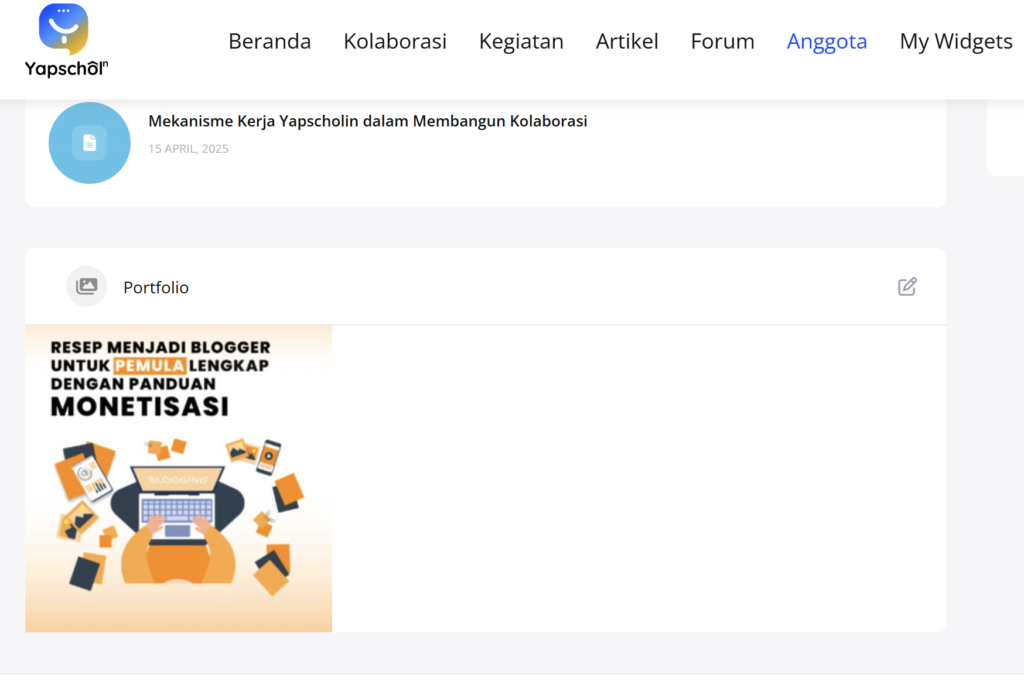 Ada kabar gembira nih—sekarang kamu bisa menambahkan dan memperbarui portfolio kamu langsung lewat website dev.yapscholn.com/. Fitur ini sangat berguna untuk kamu yang ingin menampilkan karya, seperti buku yang telah diterbitkan, desain, atau proyek lainnya.