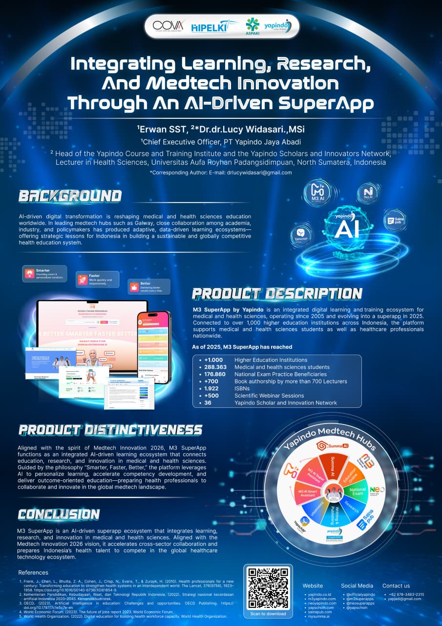 Model seperti M3 SuperApp by Yapindo dan Yapindo Medtech Hubs memperlihatkan bagaimana platform terintegrasi mampu berkembang menjadi ekosistem pembelajaran sepanjang hayat, sekaligus laboratorium sosial bagi lahirnya pengetahuan dan inovasi kesehatan. Ketika mahasiswa dan tenaga kesehatan berpartisipasi secara aktif dalam forum diskusi ilmiah digital yang terintegrasi—melalui kegiatan menulis, penelitian kolaboratif, telaah kritis literatur, dan pertukaran gagasan lintas disiplin—transformasi digital melampaui sekadar adopsi teknologi. Proses ini bertransformasi menjadi mekanisme pembentukan kapasitas inovasi yang konkret dan terukur, di mana kemampuan berpikir kritis, perumusan solusi berbasis bukti, serta kontribusi ilmiah terhadap permasalahan kesehatan nasional berkembang secara sistematis dan berkelanjutan.