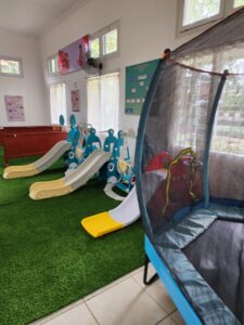 Gambar : Perosotan dan jumping games di Kartika school. Perosotan melatih koordinasi tubuh, keseimbangan, dan ketangkasan sambil membangun keberanian, percaya diri, serta kemampuan sosial melalui giliran bermain; dan jumping games melatih kekuatan kaki, keseimbangan tubuh, dan keberanian anak dalam mengambil risiko secara aman dan percaya diri.
