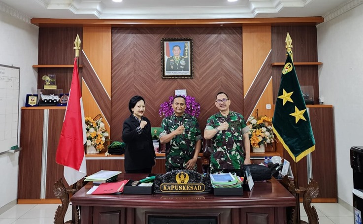 Foto.Bersama Kepala Pusat Kesehatan Angkatan Darat Mayjen TNI dr. Bima Wisnu Nugraha, Sp,THT., M.Kes., M.A.R.S. dan Kepala Lembaga Farmasi Angkatan Darat Dr. apt. Drs. Timbul Partogi H. Simorangkir, M.Si., CIT.